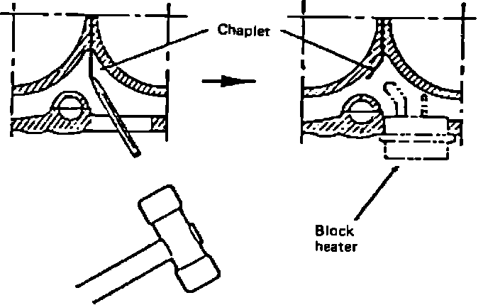 3. Use a blunt punch to bend the chaplet (metal), which is located in the water jacket, away from the expansion plug hole. This will provide clearance for the heating element of the block heater (Figure 10).