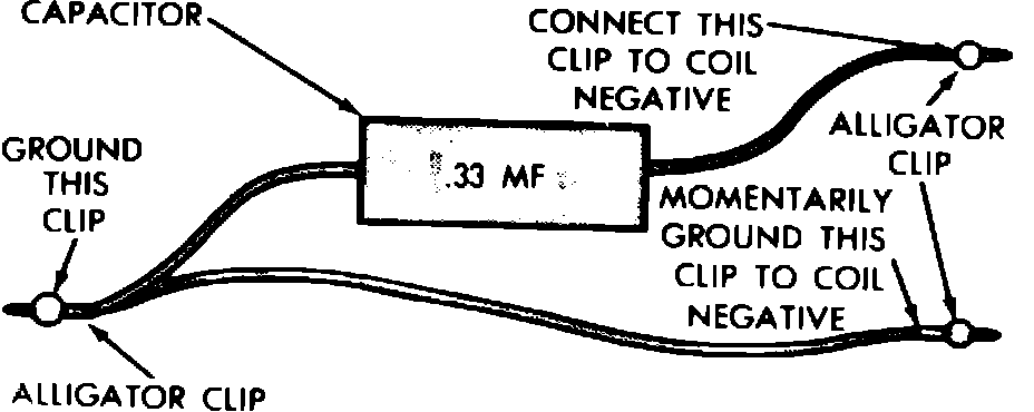 4. Connect special jumper wire, Fig. 2, to coil negative terminal. Turn ignition On, position coil high tension lead as described in step 1, then momentarily touch other end of jumper wire to a good ground.