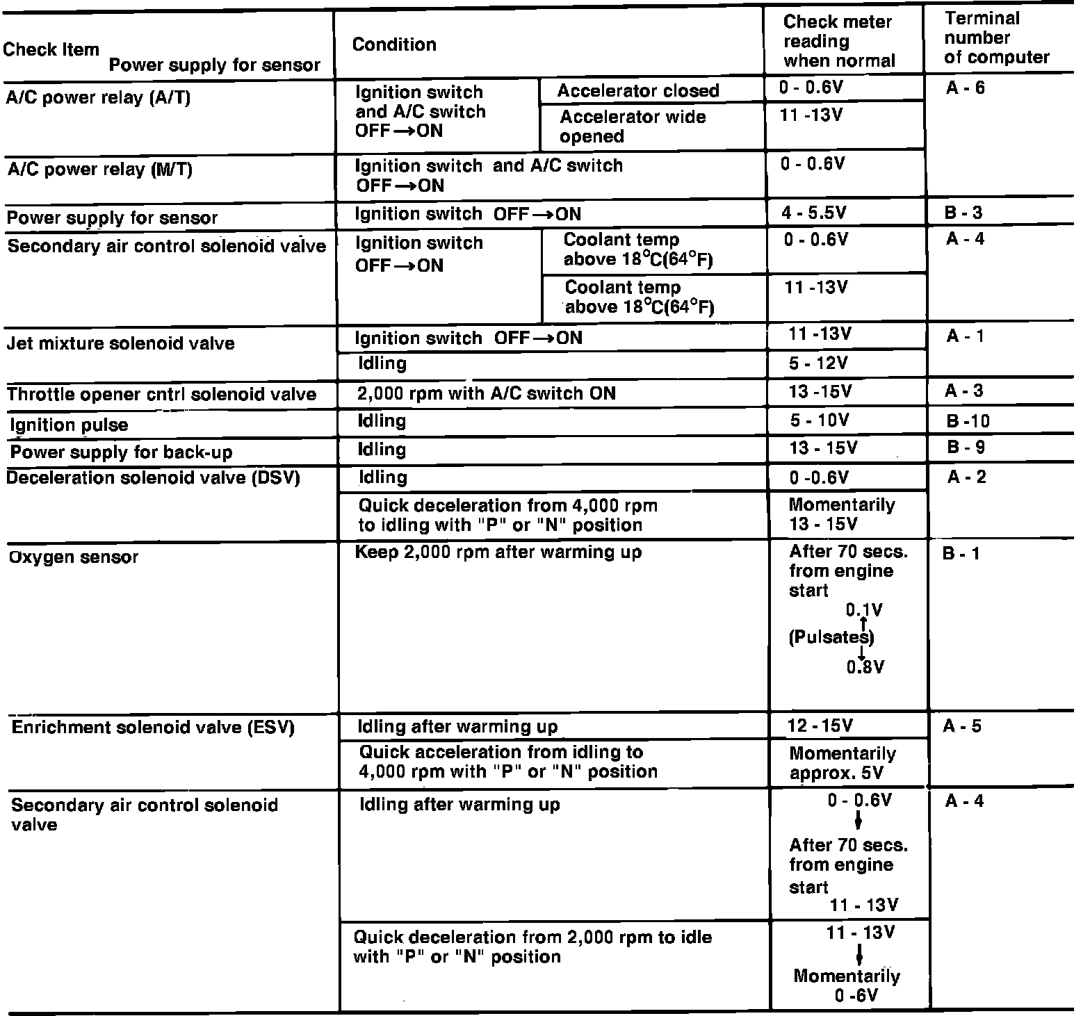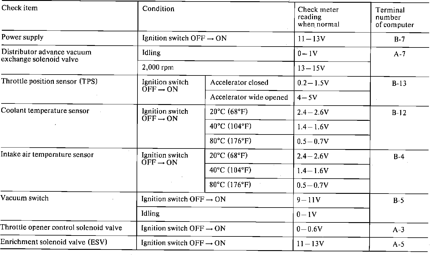 If any of above conditions are noted, first perform basic engine checks (ignition system malfunctions, incorrect engine adjustment, etc.). The FBC system can be checked by use of voltmeter. Inspection procedure as follows.