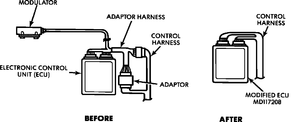 On vehicles built before February 11, 1985, it will be necessary to remove the modulator and adapter harness and connect the main wiring to the new ECU, as shown below. Remove old ECU and install new ECU, PN MD117208, according to the service manual procedure.
