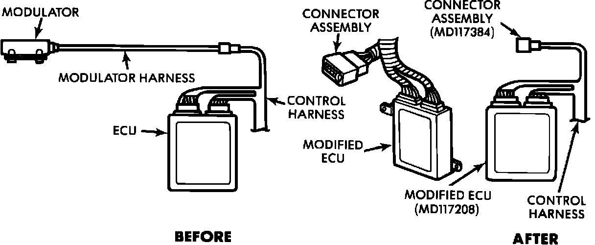 On 1985 vehicles built on or after February 11, 1985, it will be necessary to remove the modulator and install a connector assembly, PN MD117387 (supplied in package), into the end of the main harness that the modulator was connected to as shown below. Remove the old ECU and install the new ECU, PN MD117208, according to the service manual procedure.