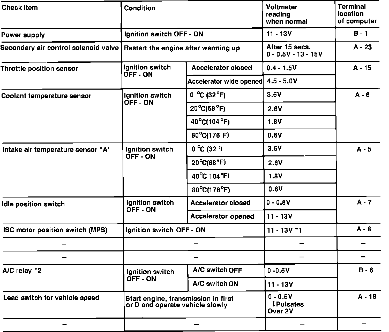 When checking the ISC motor position switch, if ignition switch is turned on for 15 seconds or more, the reading will drop momentarily below 5 volts. When checking pressure sensor with engine idling, the reading will increase momentarily to 1.5-2.6 volts every 2 minutes.