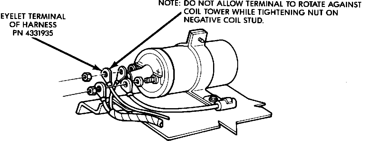 CAUTION: MAKE SURE THAT THE WIRE END OF THE TERMINAL IS POINTING AWAY FROM THE COIL SECONDARY TOWER WHEN NUT IS TIGHTENED TO AVOID ARCING.