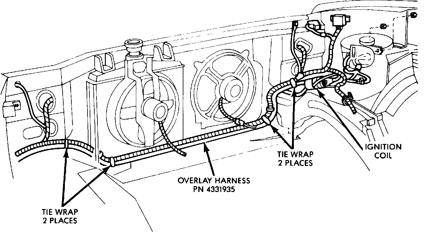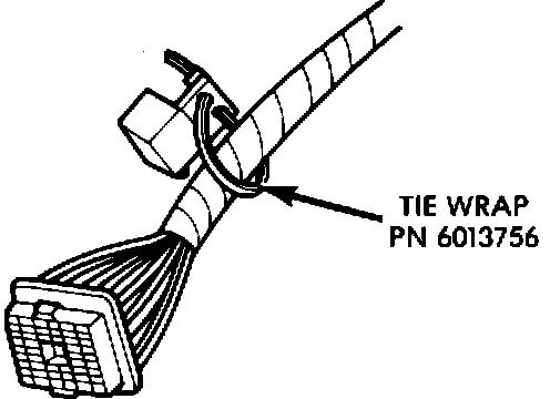 4. Route the overlay harness along the existing headlamp-to-dash main wiring harness from the coil forward to radiator cowl panel. Then toward the left side of the engine compartment under fans and radiator (Figure 1-B). Route harness upward and toward the rear of the engine compartment to the bulkhead connector (Figure 1-C). Pass it through the large retainer clip nearest the bulkhead connector. Secure the overlay harness by using existing wiring clips and six tie wraps, PN 6015756, to the existing main wiring harness (Figures 1-B and 1-C).