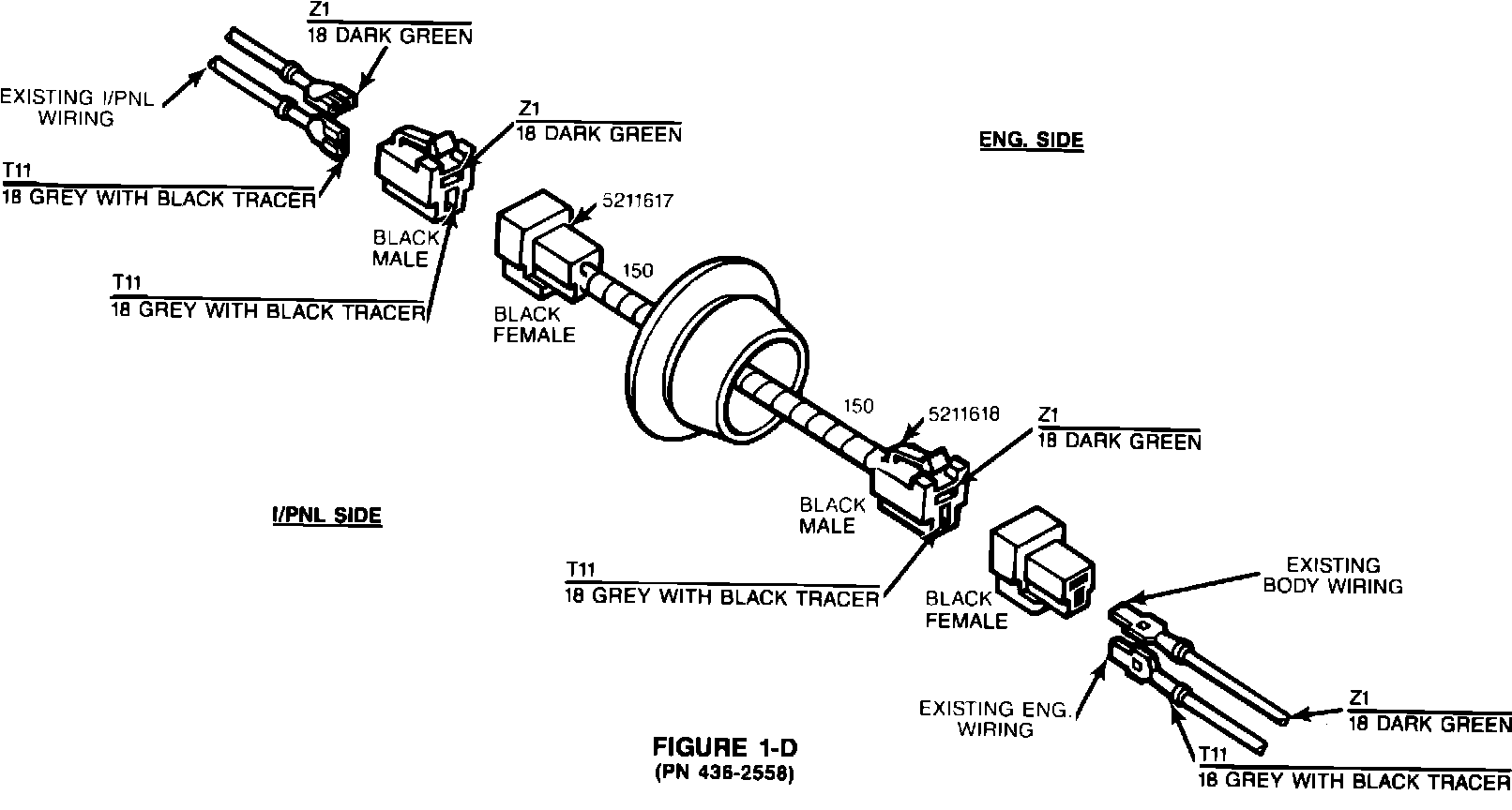 2. Insert the two bare terminals from the instrument panel overlay harness, PN 4331574, into insulator, PN 5211618, located on instrument panel side of jumper, PN 4362558 (Figure 1-D).