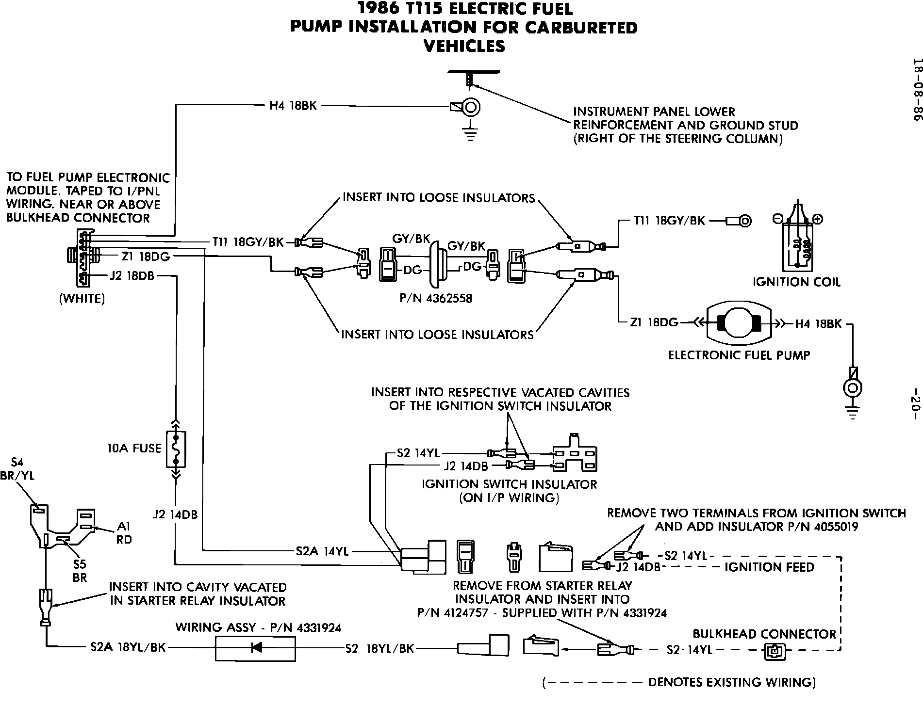 This repair procedure involves the installation of an in-tank electric fuel pump to prevent fuel starvation caused by vapor lock.A. Engine Compartment Wiring Harness PN 4331935, Jumper (dash) Wiring Assembly PN 4362558 & Diode Wiring Jumper PN 4331924