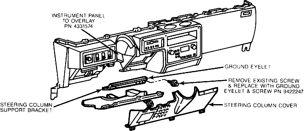 6. Remove the far right-hand screw from the lower reinforcement steering column support bracket. Secure bare eyelet ground terminal (black wire) from the instrument panel overlay harness, PN 4331574, to the steering column support bracket using screw, PN 9422247 (Figure 2-A). Tighten securely.