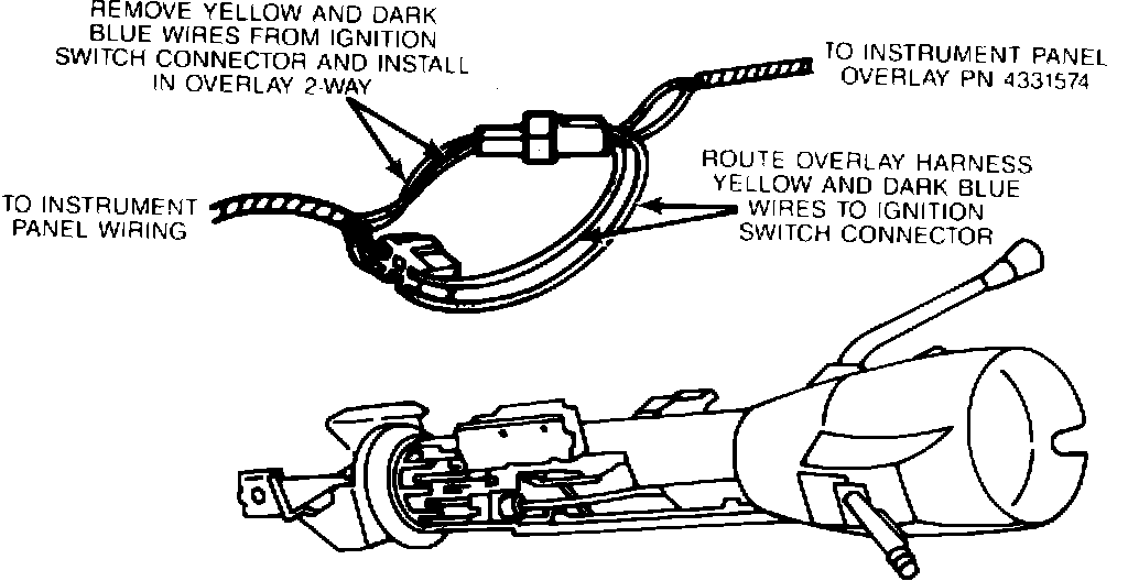 Install the bare terminal yellow wire of the instrument panel overlay harness, PN 4331574, into the previously vacated cavity in the ignition switch connector (Figures 2-C and 6).