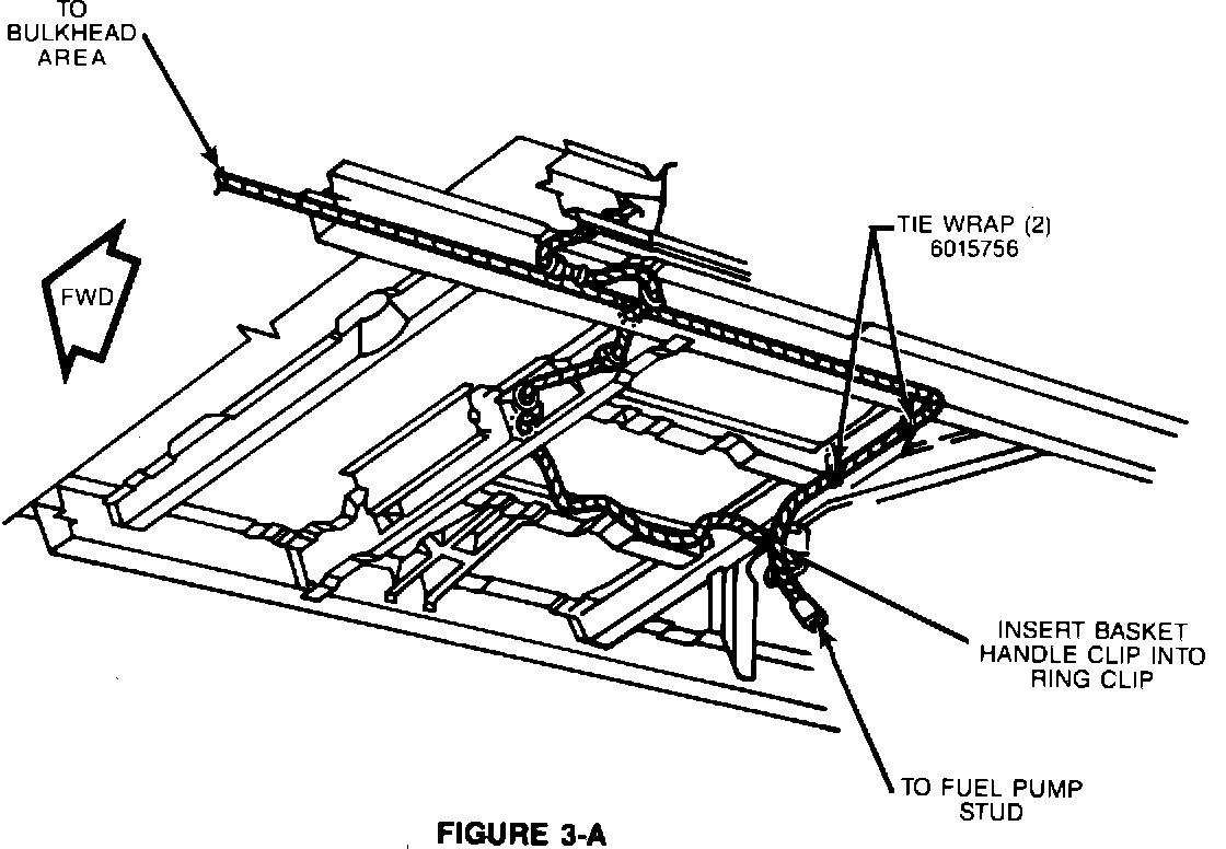 2. Insert the "basket handle" type clip into the existing ring clip on rear crossmember. Route the harness along the rear crossmember to the left frame rail. Secure the harness using two tie wraps, PN 6015756 (Figure 3-A).
