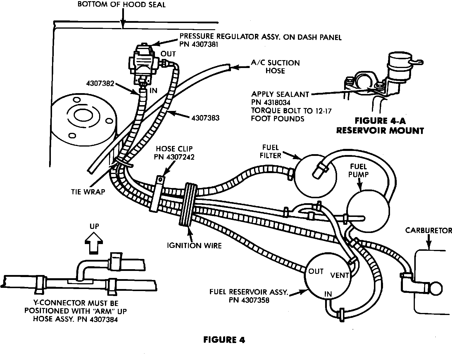8. Connect hose assembly, PN 4307382, from the fuel reservoir outlet (on the bottom of the reservoir) to the pressure regulator inlet (bottom fitting) - (Figure 4). Route this hose over the coolant hose, under the ignition wires, over the A/C liquid line (small), and over the A/C suction line (large). Clamp with hose clamp, PN 6500650. Torque to 10 inch pounds.