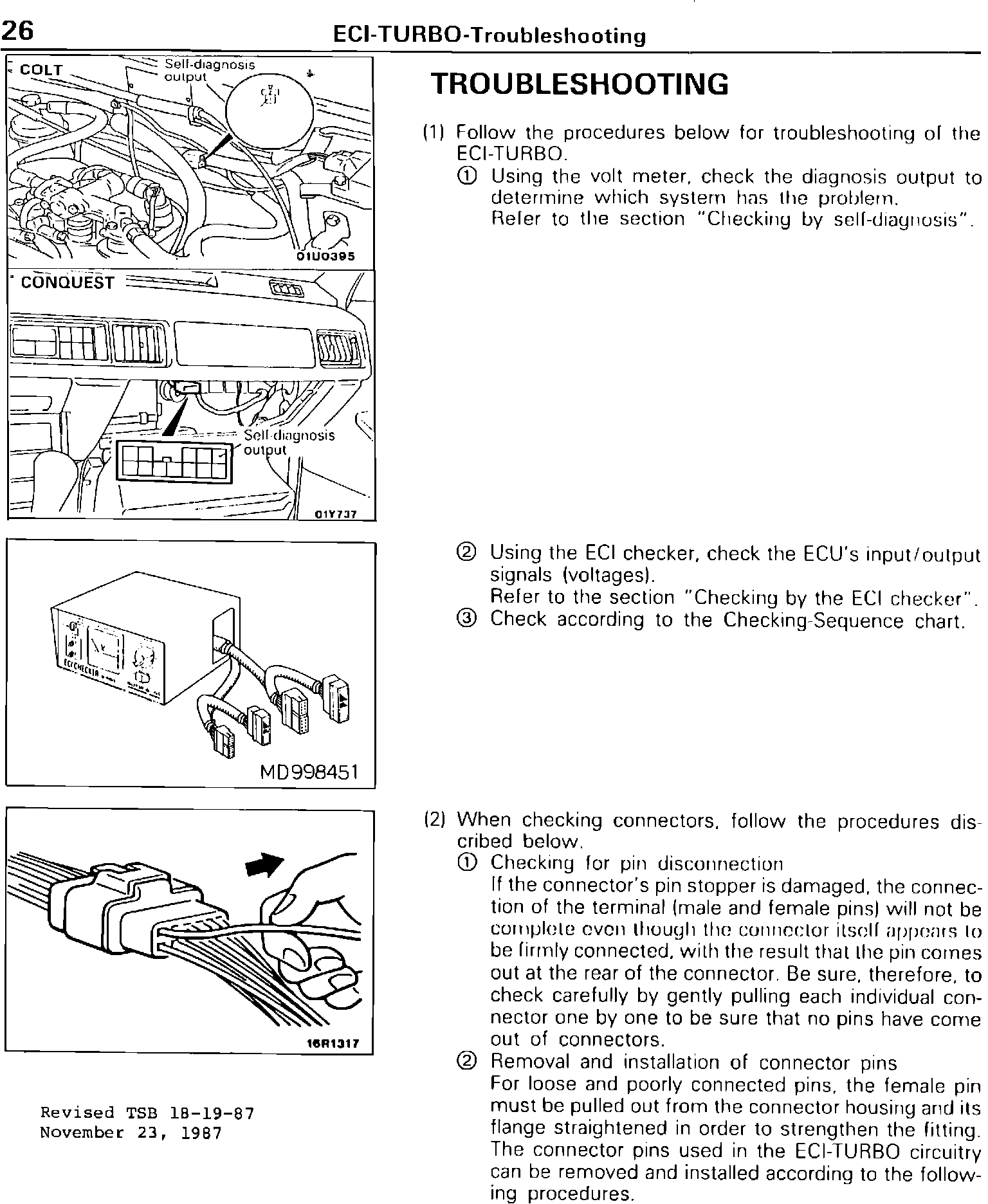 This bulletin is issued to revise and update the Colt/Conquest ECI-Turbo Driveability Troubleshooting Manual, publication #81-699-7032, to include 1988 models.