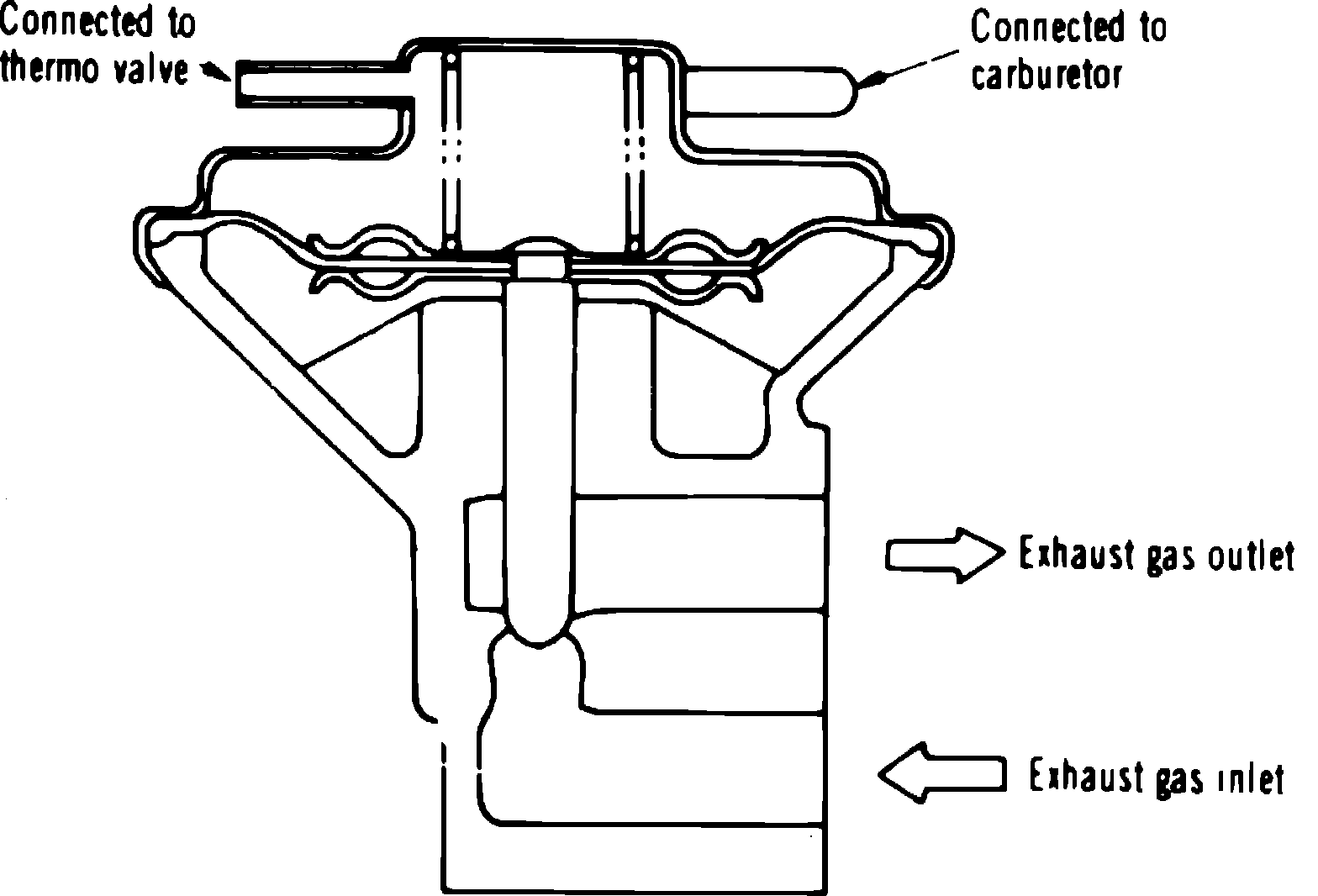 The single type EGR Control Valve, Fig. 7, is operated by carburetor vacuum in response to throttle valve opening. EGR flow is not available at idle or wide open throttle operation. The dual type EGR Control Valve, Fig. 8, consists of primary and secondary valves which are operated by different carburetor vacuums in response to throttle valve opening. The primary valve controls EGR flow when the throttle valve is slightly open, while the secondary valve controls EGR flow during wider throttle openings. EGR flow is not available at idle or wide open throttle operation.
