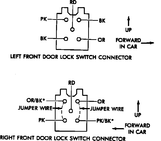 1. Remove the right door switch from the door panel and disconnect the wires from the back of the switch. Connect jumper wires as indicated to the right door wiring harness. These jumper wires take the place of the switch in the inactive position. Operate the door locks using the left door switch.