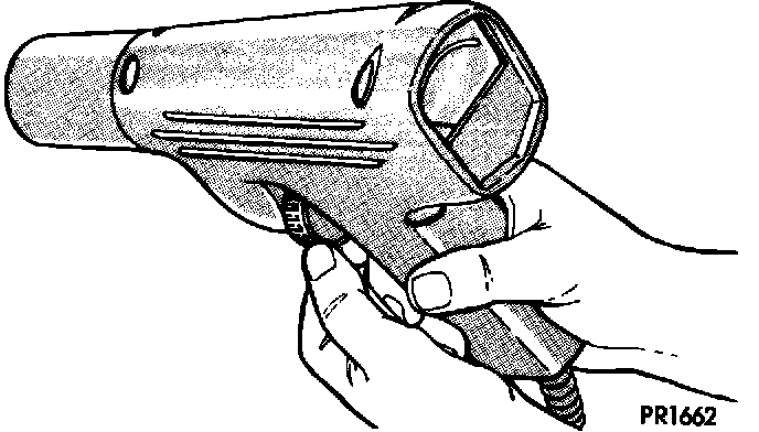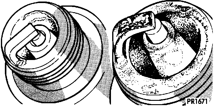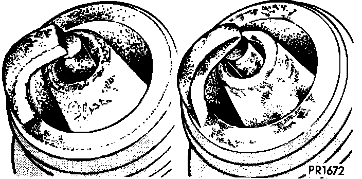 Normal Conditions Normal conditions (Fig. 11 left). This plug has been running at the correct temperature in a "healthy" engine. The few deposits present will probably be light tan or gray in color with most regular grades of commercial gasoline. Electrode burning will not be in evidence; gap growth will average not more than about 0.025 mm (0.001 in.) 1600 km (1000 miles). Chances are the plug as pictured, could be cleaned, the gap electrodes filed, regapped and reinstalled with good results.