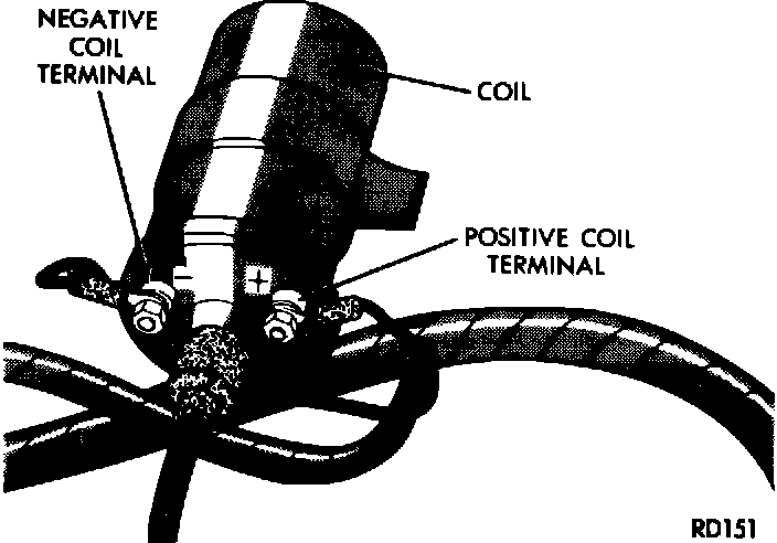 (2) Connect red lead of the test tachometer unit to the negative primary terminal of the coil and the black lead to a good ground (Fig. 2).