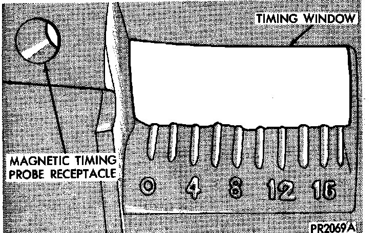(8) Aim Power Timing Lamp (Fig. 1) at timing hole in bell housing (Fig. 3) or read magnetic timing unit. If flash occurs when timing mark is before specified degree mark, timing is advanced. To adjust, turn distributor housing in direction of rotor rotation. If flash occurs when timing mark is after specified degree mark, timing is retarded. To adjust, turn distributor housing against direction of rotor rotation. If timing is within +/- 2~ of value specified on the label, proceed to step (10). If outside specified tolerance proceed to next step.