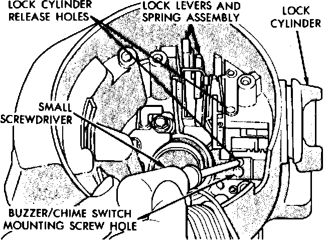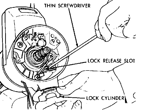 5. Insert a thin screwdriver into lock cylinder release slot and depress spring latch which releases lock cylinder, then grasp lock cylinder and remove from column.