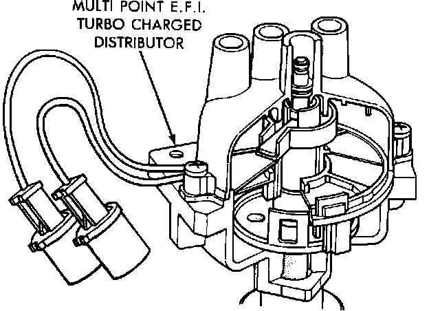 The Hall Effect Pick-Up supplies crankshaft and camshaft position reference signals to the Single Module Engine Controller (SMEC). The Hall effect device consists of a magnet and a Hall switch mounted with a gap between the switch and magnet. Rotating in the gap is an armature with windows and tabs. When a tab is in between the switch and magnet, the magnetic lines of flux are shunted through the tab increasing the effect of the magnet on the Hall switch turning it on. When the window is between the magnet and the Hall switch the magnet alone is not enough to trigger the switch. The digital output signal of the Hall effect sensor is then used by the SMEC for crankshaft and camshaft position reference signals. The Hall effect pick-up is located in the distributor assembly. On turbo vehicles there is a second pickup in the distributor for timing of the multi-point injection.