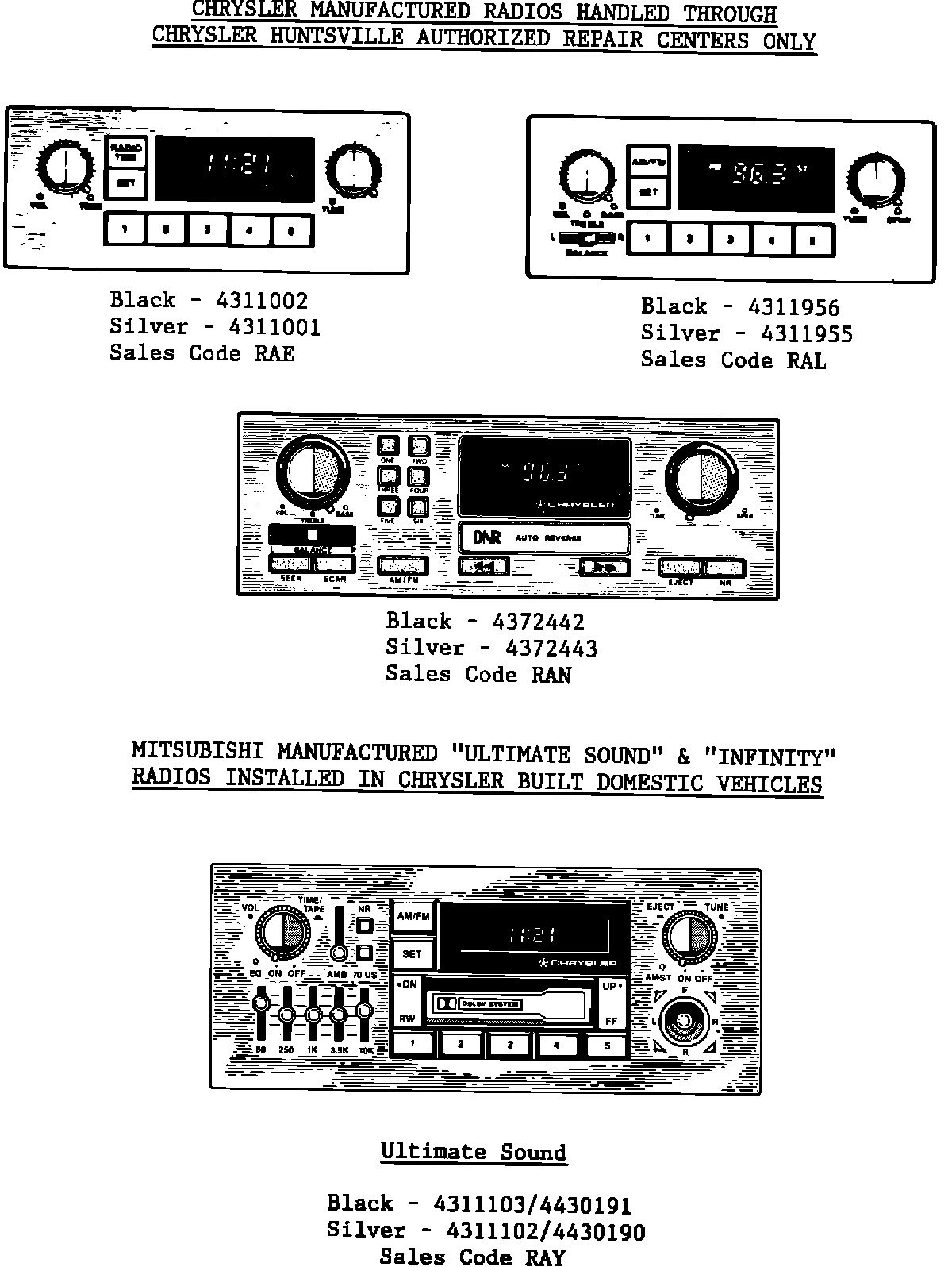 Warranty service for Chrysler manufactured radios is handled through Chrysler Authorized Service Centers. Warranty service for Mitsubishi manufactured radios, including the "Ultimate Sound" and "Infinity", is handled through Mitsubishi Authorized Service Centers. The "Ultimate Sound" and "Infinity" radio can be identified by the model numbers and graphics as shown on pages 5 and 6. Other Mitsubishi radios are identified by the Mitsubishi logo on the face plate, as shown on pages 12, 14 and 15.