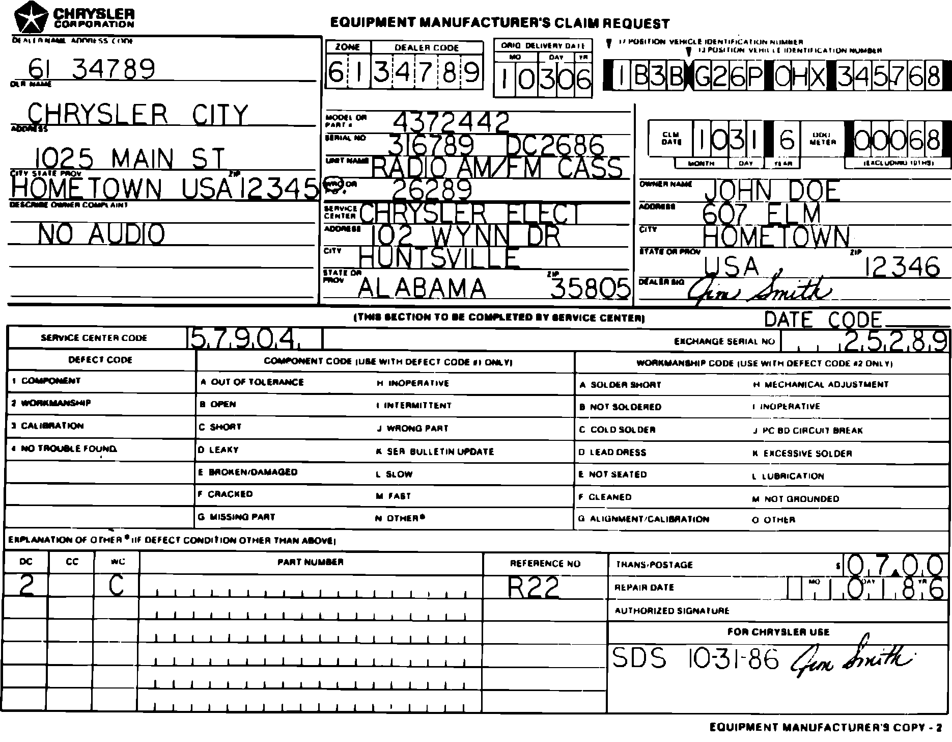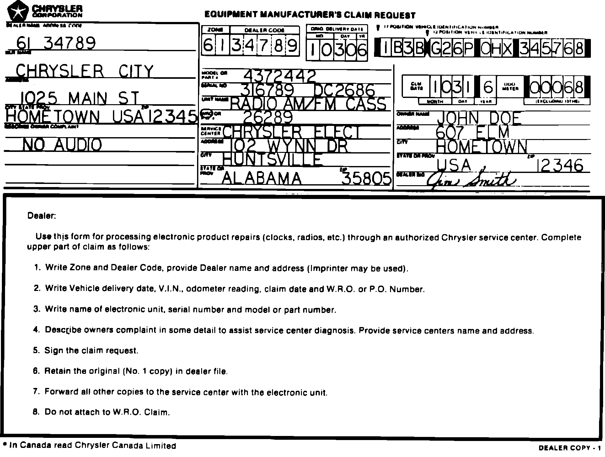 3. Give Exchange Center the pertinent information to ship an exchange radio such as radio model number and description, as well as dealer name, address, zone, dealer code, in-service date, and vehicle identification number.