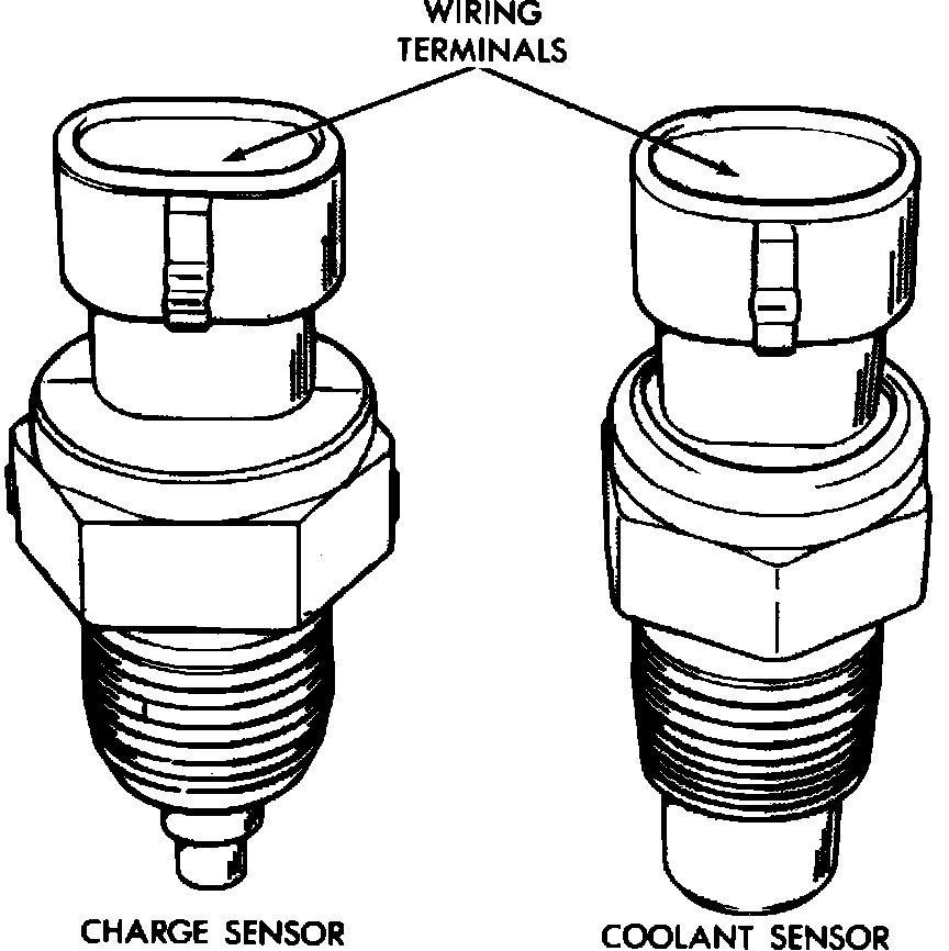 The coolant temperature sensor, Fig. 5, is mounted in the thermostat housing and allows the SMEC to monitor engine operating temperature in order to provide proper air/fuel mixtures. The sensor provides a variable resistance which is proportional to coolant temperature. When the engine is cold and sensor resistance is low, the SMEC provides richer air/fuel mixtures and increases engine idle speed to provide acceptable cold engine performance and allow quick warm up. When coolant temperature and sensor resistance increase, the SMEC provides leaner air/fuel mixtures and lowers engine idle speed to provide proper exhaust emission control and increased fuel economy.