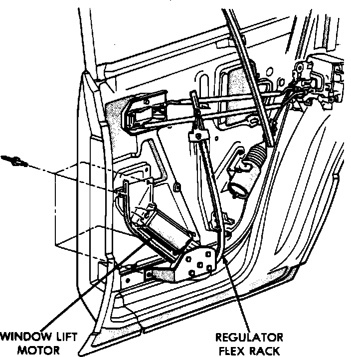 The window regulator is of a conventional sector gear design. The power window motor is attached to the window regulator. The window motor/regulator assembly is attached to the inner door panel of each door. Two door models that are equipped with rear power windows have a separate window motor/regulator assembly in the rear quarter panels.