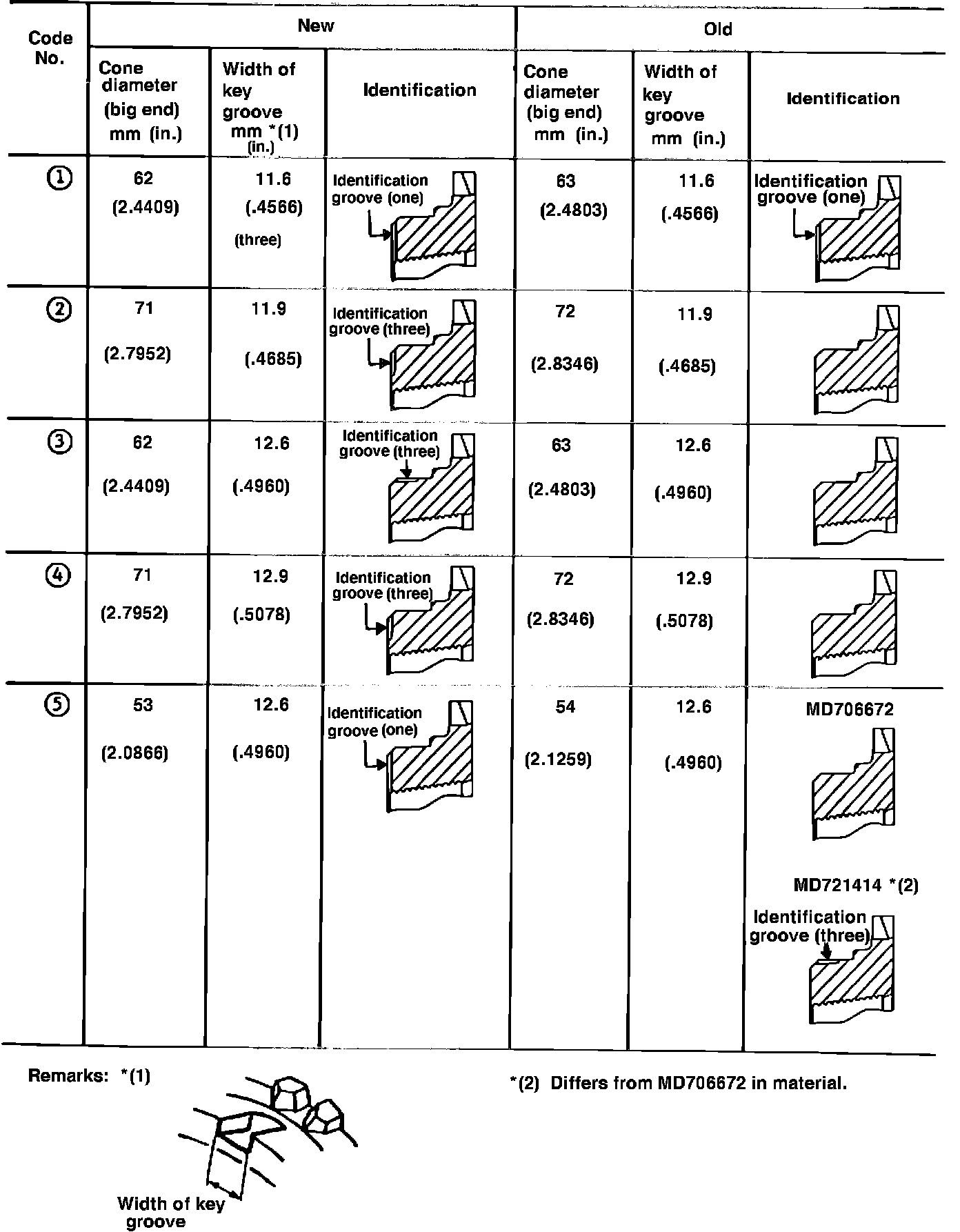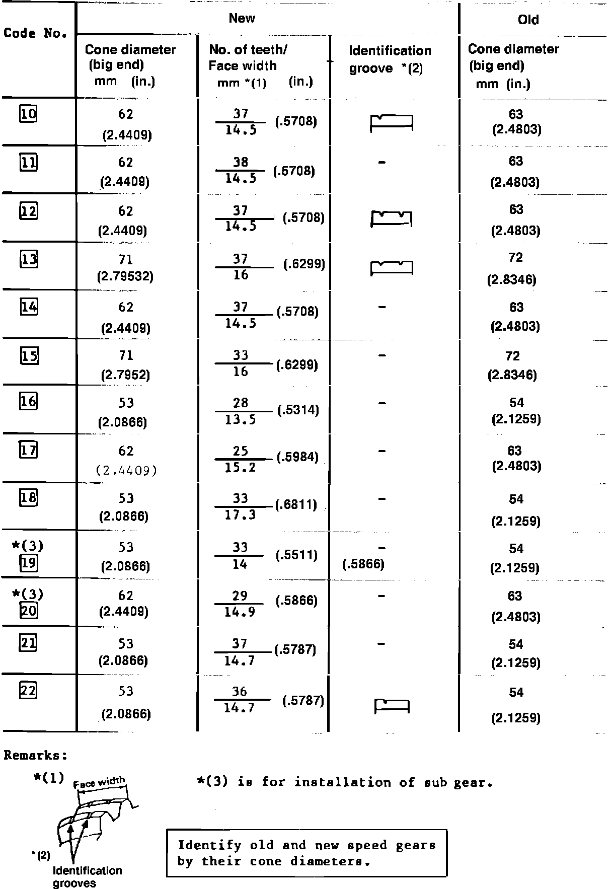Effective in October, 1987, with transaxle No. EX4200 and later, the diameter of the synchronizer ring cone used in the KM200 series transaxle was decreased by 1 mm (.03937 in.). This change was made to improve durability. Due to this change, the cone diameter of each speed gear was also decreased by 1 mm (.03937 in.) The new synchronizer ring cone is not interchangeable in earlier built transaxles unless it is changed together with its new speed gear. An Old and New Part Number Identification Chart along with a Synchronizer Ring Identification Chart and a Speed Gear Identification Chart are included in this Technical Service Bulletin for your convenience.