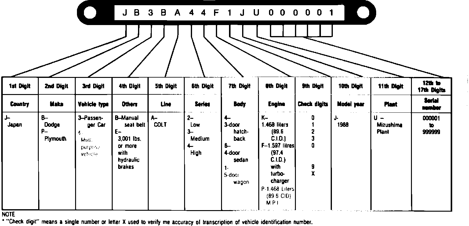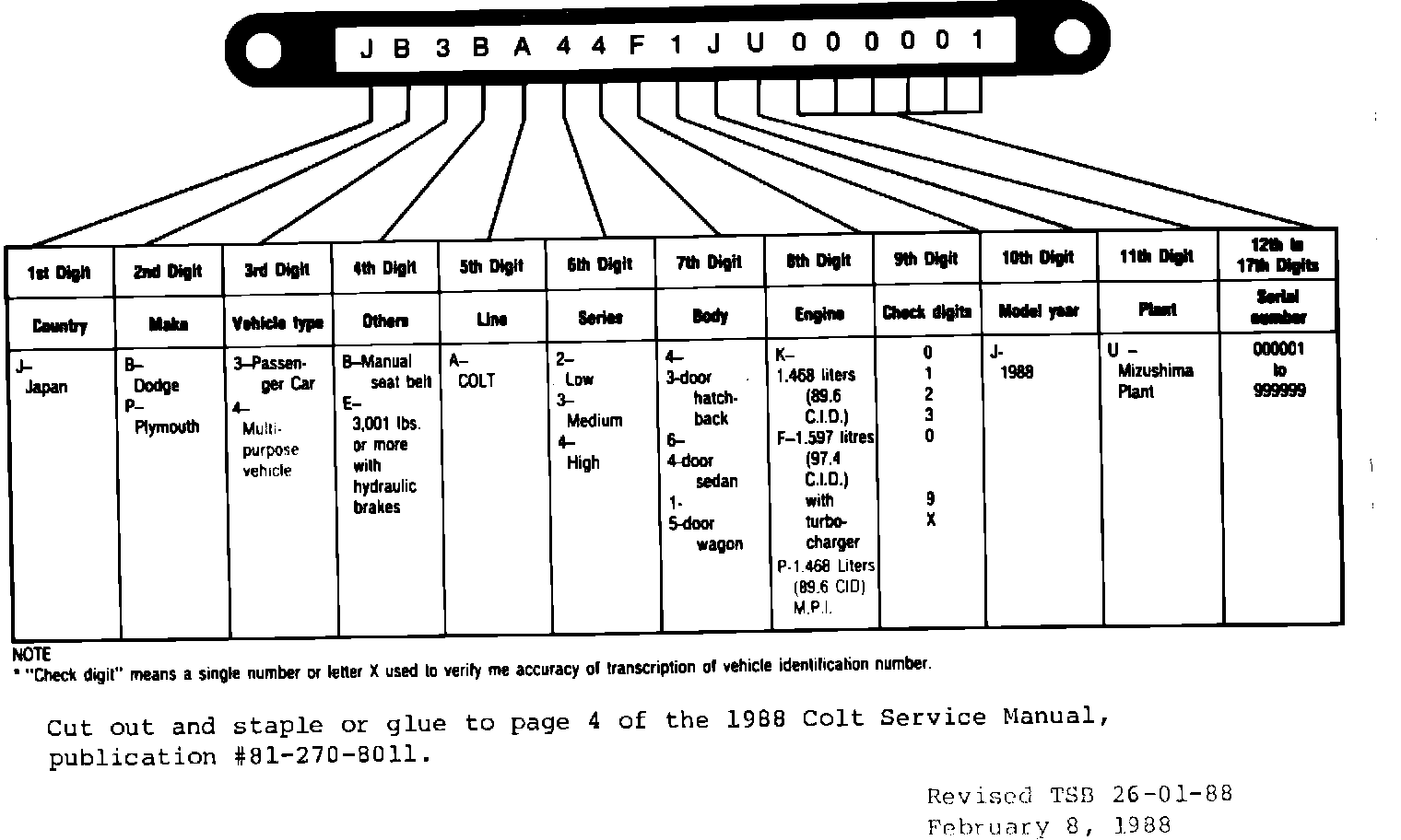 The attached pages revise and update Technical Service Bulletin 26-08-87 page 9, and page 4 of your 1988 Colt Service Manuals to include the Colt 1.5L M.P.I.. engine.