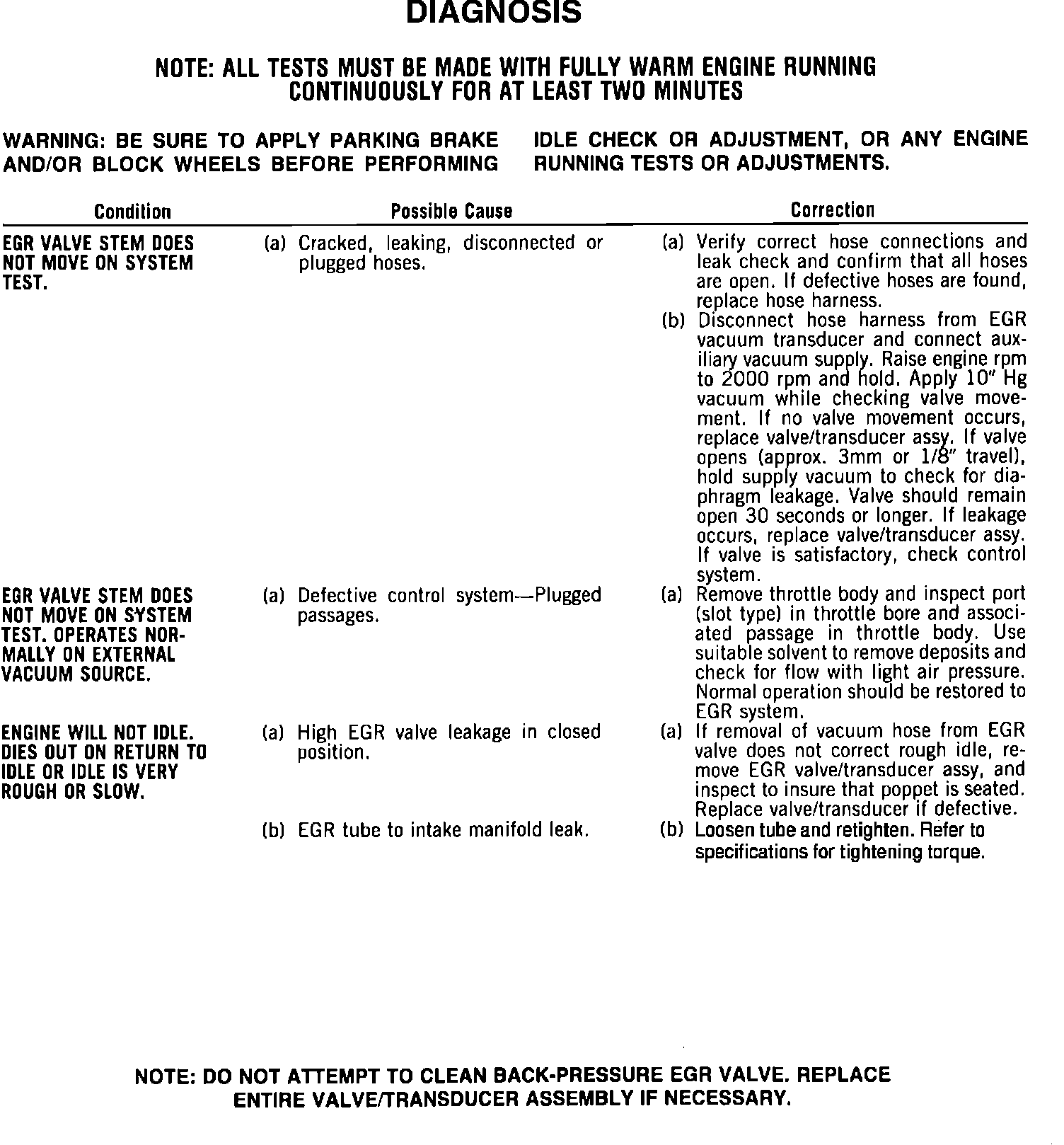 7. If engine rpm does not drop when vacuum is applied to the EGR vacuum diaphragm, then a defective EGR valve or plugged EGR passage, or tube is indicated. The EGR valve, intake manifold passage, and tube assembly should be removed, inspected, and cleaned or replaced. Refer to MAINTENANCE PROCEDURES for cleaning and inspection procedures for the EGR valve and passages.