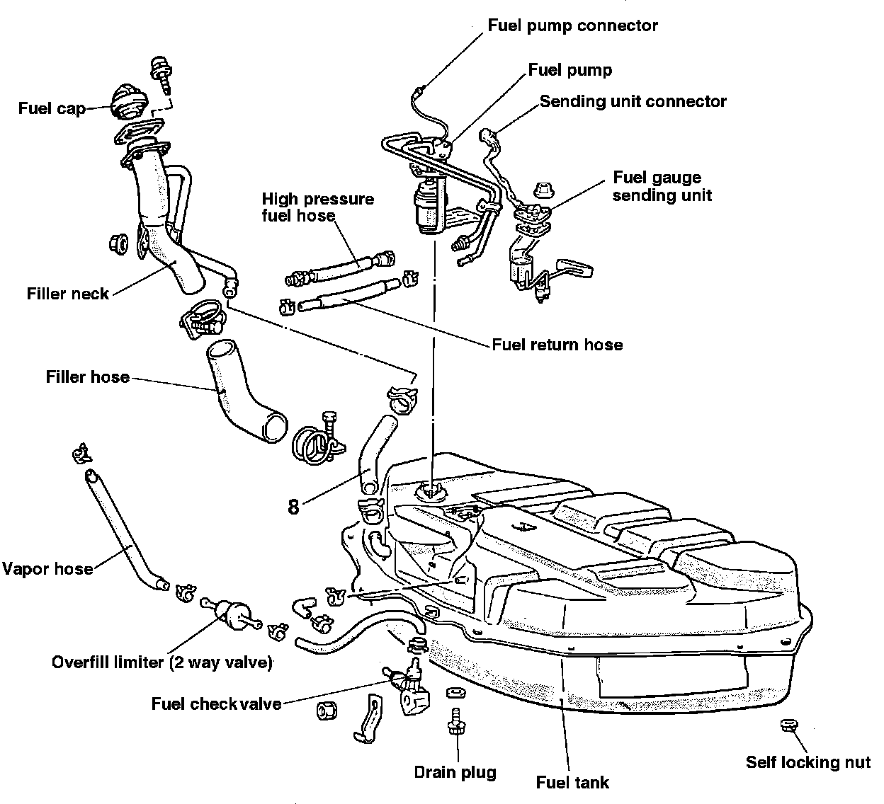 The overfill limiter is mounted in-line, in the vapor line, on the LH side of the fuel tank.