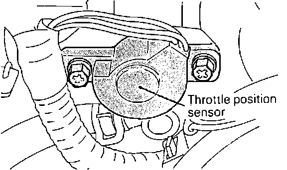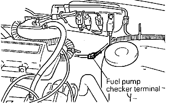 The fuel pump check terminal (shown hooked-up) is located in the engine compartment next to the left side strut tower.