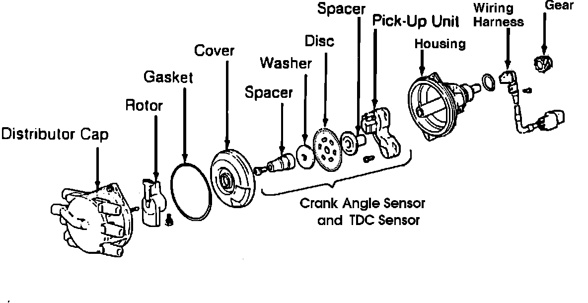 The Crank Angle Sensor and the Top Dead Center Sensor are located within the distributor housing. These sensors are incorporated into one unit, being a disc and a pick-up unit. The disc is affixed to the distributor shaft and the light-transmitting unit is mounted stationary to the distributor housing.Exploded View Of Distributor: