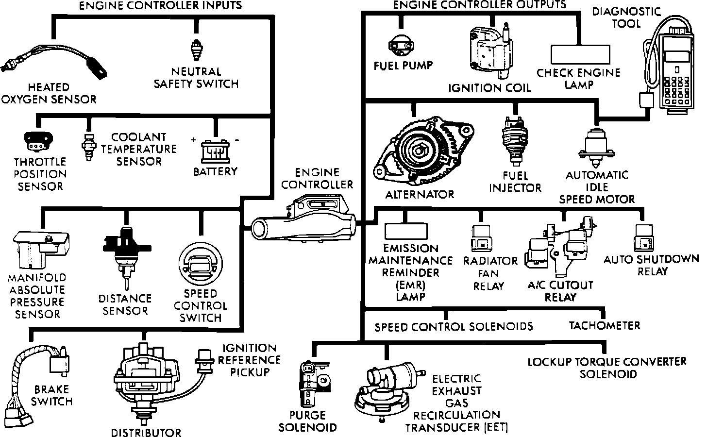 Various sensors provide necessary input for the SBEC to function correctly. Some of these include the Manifold Absolute Pressure Sensor, Throttle Position Sensor, Oxygen Sensor, Coolant Temperature Sensor, and Vehicle Distance Sensors. In addition to these sensors, various switches and relays are used to carry out commands or outputs from the SBEC.