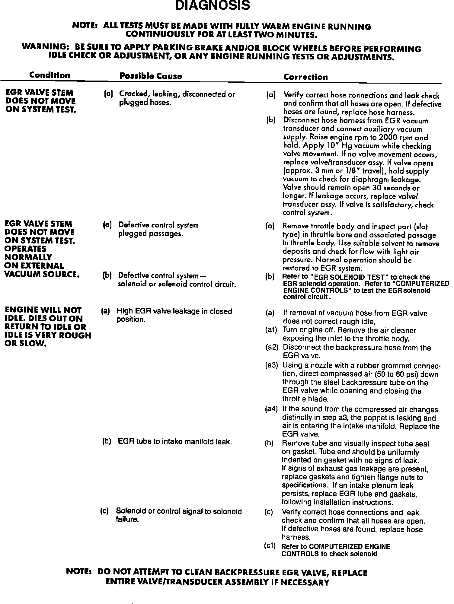 7. If engine rpm does not drop when vacuum is applied to the EGR vacuum diaphragm, then a defective EGR valve or plugged EGR passage, or tube is indicated. The EGR valve, intake manifold passage, and tube assembly should be removed, inspected, and cleaned or replaced. Refer to MAINTENANCE PROCEDURES for cleaning and inspection procedures for the EGR valve and passages.