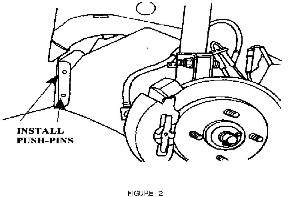 4. Position the splash shield extension between the splash shield and the inner fender well. install the 2 push pins. The top of the shield extension will be loose against the frame rail. Figure 2