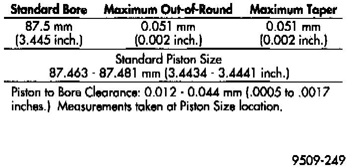 The cylinder walls should be checked for out-of-round and taper with Tool C-119, or equivalent. The cylinder bore out-of-round is 0.050 mm (0.002 inch) maximum and cylinder bore taper is 0.051 mm (0.002 inch) maximum. If the cylinder walls are badly scuffed or scored, the cylinder block should be rebored and honed, and new pistons and rings fitted. Whatever type of boring equipment is used, boring and honing operation should be closely coordinated with the fitting of pistons and rings in order that specified clearances may be maintained.