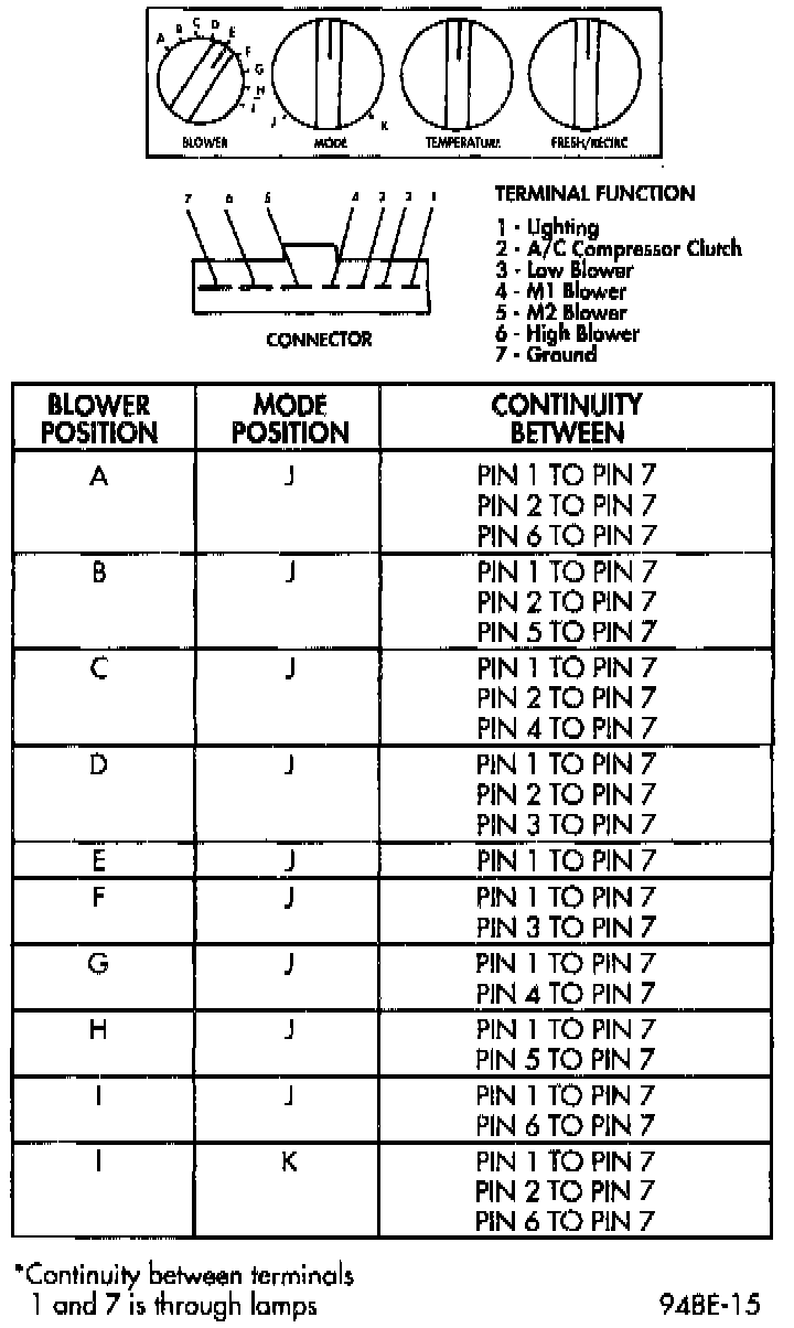 3. If the switch fails any part of the continuity test, other then Pin 1 to Pin 7, replace Heater A/C Control. If no continuity between Pin 1 to Pin 7 check the lamps, replace if necessary.