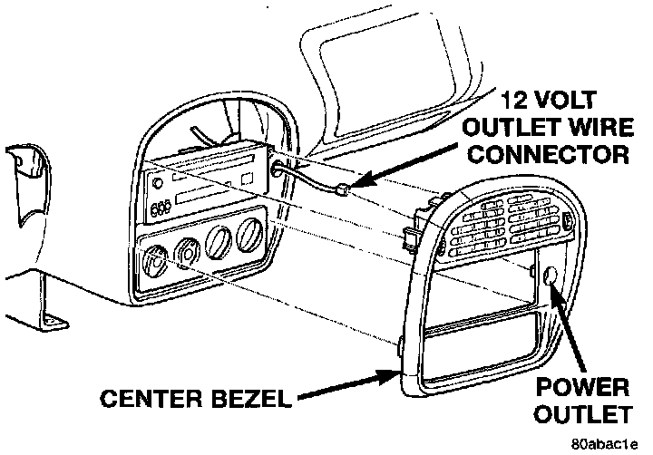 1. Pull center bezel straight rearward along the sides of the radio and A/C control openings to disengage four clips and disconnect the power outlet wire connector.