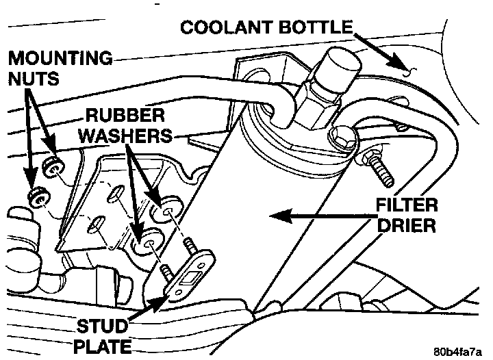 4. Remove filter/drier bracket mounting nuts and fastener.