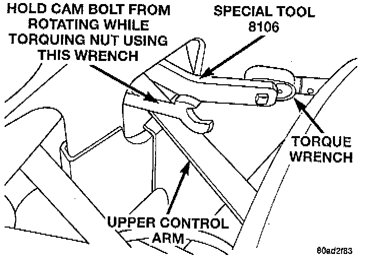 NOTE: When tightening the upper control arm cam bolts using Adapter, Special Tool 8106, the mechanical advantage of a torque wrench is increased by a factor of 1.5. For this reason the actual torque wrench reading or setting will be lower then the torque specification Example: If the torque specified is 108 Nm (80 ft. lbs.) the torque wrench reading or setting should be 72 Nm (53 ft. lbs.).