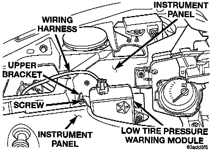 3. Remove screw, mounting upper bracket on low tire pressure warning module to the instrument panel.