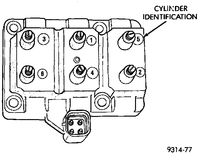 The coil assembly consists of 3 coils molded together. The coil assembly is mounted on the intake manifold. High tension leads route to each cylinder from the coil. The coil fires two spark plugs every power stroke. One plug is the cylinder under compression, the other cylinder fires on the exhaust stroke. The PCM determines which of the coils to charge and fire at the correct time.