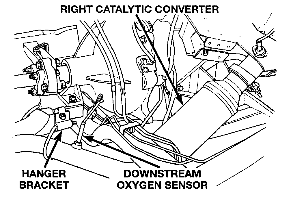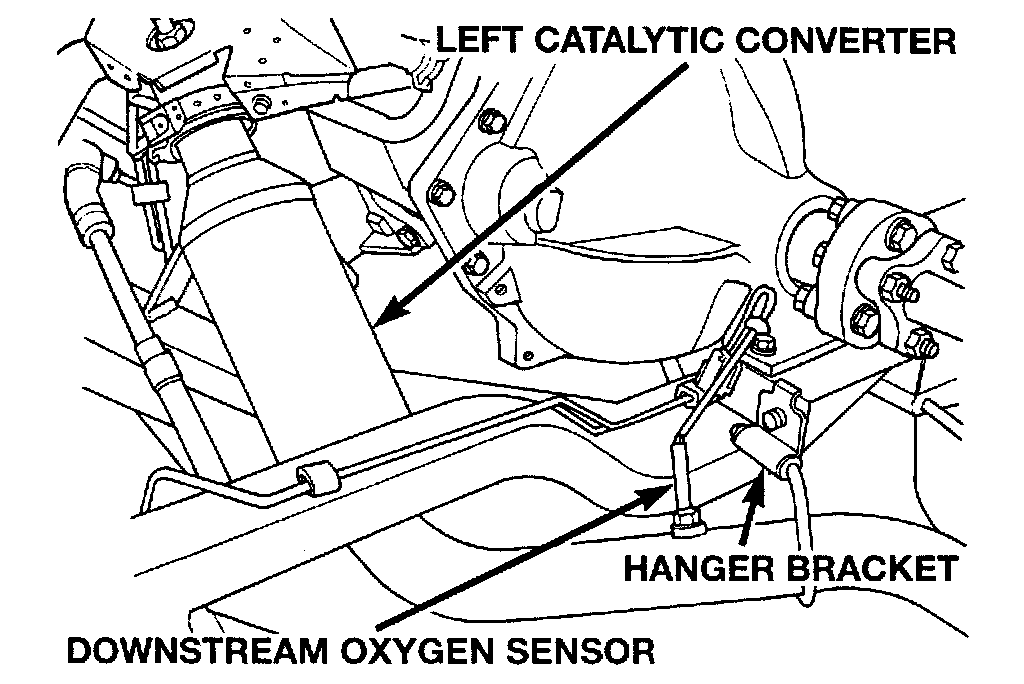 The downstream heated oxygen sensors thread into the outlet pipe at the rear of the catalytic convertors. The downstream heated oxygen sensor input is used to detect catalytic convertor deterioration. As the convertor deteriorates, the input from the downstream sensor begins to match the upstream sensor input except for a slight time delay By comparing the downstream heated oxygen sensor input to the input from the upstream sensor, the PCM calculates catalytic convertor efficiency.