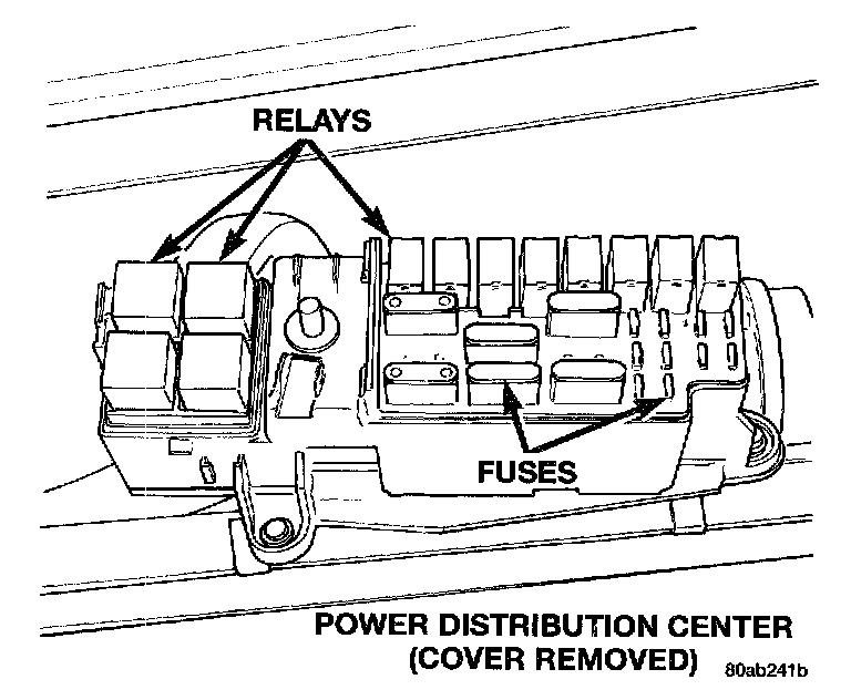 The ASD relay and fuel pump relay are located in the Power Distribution Center (PDC) near the battery. A decal on the underside of the PDC cover shows the locations of each relay and fuse contained in the PDC.