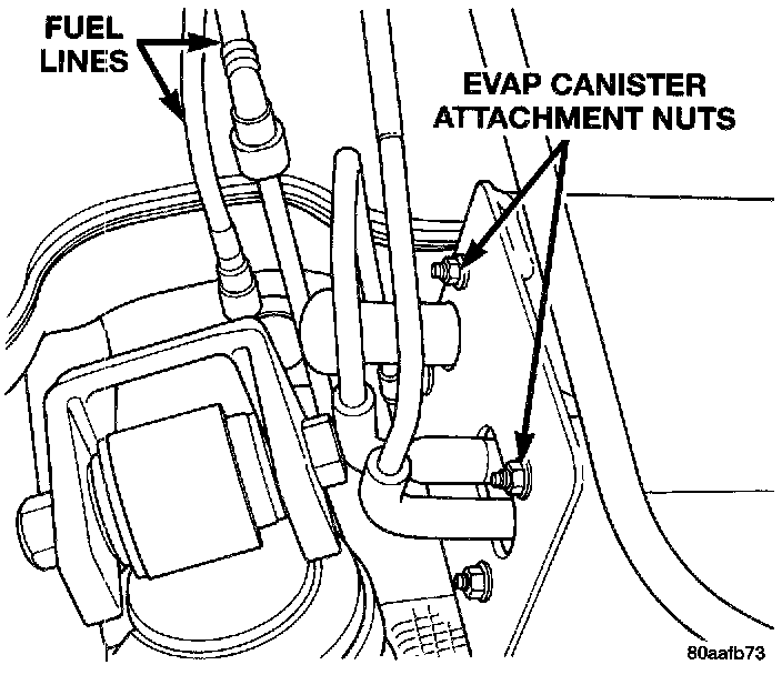 The canister mounts to a bracket that mounts to the frame rail near the right rear wheel. The canister protrudes through the top of the bracket. The vacuum and vapor tube connect to the top of the canister.