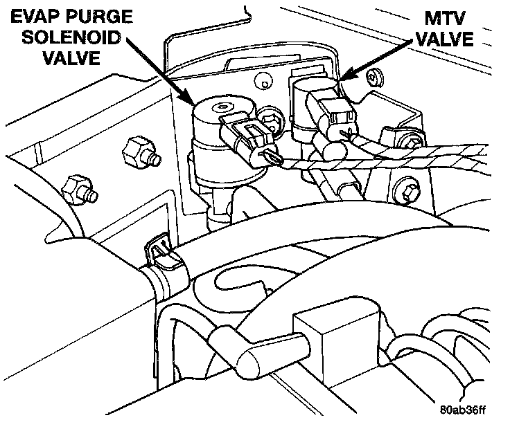 The EVAP purge solenoid and bracket attach to the right inner fender well next to the dash panel. The top of the solenoid has the word TOP on it. The solenoid will not operate unless it is installed correctly. If the vehicle has a 3.5L engine, the EVAP purge solenoid shares a bracket with the MTV solenoid.