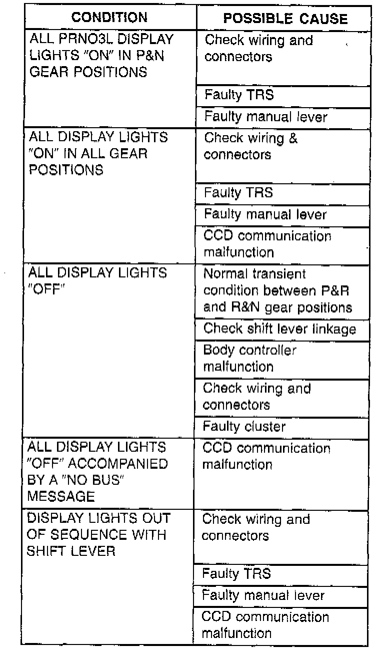 The Transmission Range Sensor (TRS) on the valve body, sends a signal to the Transmission Control Module (TCM) on the position of the transaxle manual valve lever. The TCM receives the switch signal and processes the data. The TCM sends the Shift Lever Position (SLP) information to the Body Control Module (BCM) via the Chrysler Collision Detection (CCD) bus. The BCM then outlines the appropriate shifter position indicator in the instrument cluster.If a problem arises with the shifter position indicator, consult the chart above for diagnostic information. If the malfunction cannot be corrected using the chart, refer to Transmission Control Systems/System Diagnosis.