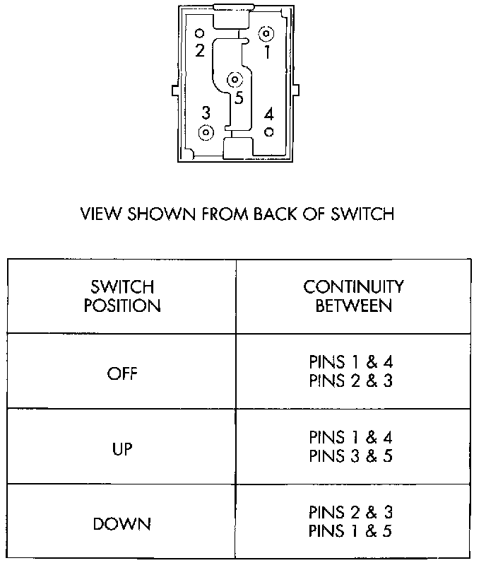 4. Connect the positive lead to Pin 1 of the harness connector and check for battery voltage. If OK, go to Window Switch Test below. If not OK, check circuit breaker in the Micro Relay Bank. If the circuit breaker is OK, repair wire as necessary.