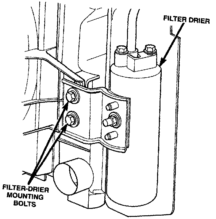 1. Before installation, replace both refrigerant line O-rings. Then reverse the above procedure. Torque filter/drier mounting bolts to 45 in. lbs. +/- 10.