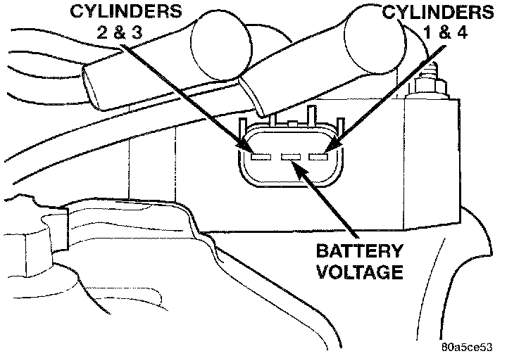 Coil one fires cylinders 1 and 4, coil two fires cylinders 2 and 3. Each coil tower is labeled with the number of the corresponding cylinder.
